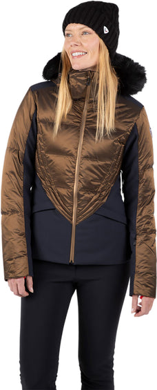 Cruising corduroy or floating through fresh pow, the women's Rossignol Direttisima Ski Jacket gives you the warmth and stretch you need to focus on your skiing. It's made of a chic mix of matte soft shell and shiny fabric with a removable faux fur hood that lets you change up your look. Premium, high-loft down seals in heat, while the waterproof, breathable membrane sheds wet weather.