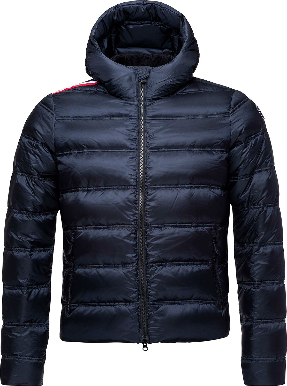A ski style that's translated for urban exploration, this men's jacket is filled with premium duck down for superior warmth and comfort during harsh winter days. A Gallic tricolor stripe on the shoulder and a blue lining that echoes the color of the iconic Strato skis give a nod to Rossignol's sport heritage.