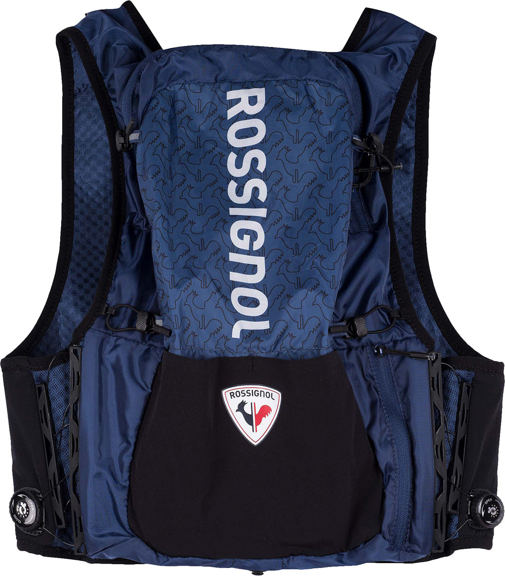 Hit the trail with everything you need to go big and stay hydrated. This Rossignol versatile vest is a must-have layer for long distance trail runs, mountain biking or cross-country skiing. The lightweight design includes dedicated front storage pockets for two water flasks (included) plus space for a larger volume hydration bladder. A dial fit system offers fast, reliable on-the-fly adjustment for a secure fit. Our exclusive and removable pole quiver design securely carries two poles on top of the back pocket. Just flip it forward for quick access to your poles. Drop-in pockets let you grab gels on the fly, and a secure pocket holds valuables and a key. A built-in safety whistle adds peace of mind.