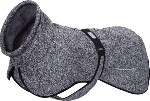 A well-fitting coat to keep the dog warm in cool weather conditions. The soft knit fleece coat has a brushed interior that feels nice against the dog’s body. The excellent cut of the garment adapts to the dog’s movements making it almost unnoticeable. Therefore, the garment is perfect for a dog that is not used to wearing clothes. The knit fleece coat made of technical material doesn’t absorb moisture and it feels comfortable to wear. The garment has a high, warming collar. A well-cut hem keeps the dog’s bigger muscle groups warm. Thanks to the elastic band and touch-fastener closure in the waist, the garment is easy to put on and to adjust to the correct size. Elastic rear leg straps ensure that the coat stays in place in all conditions, also in activities of higher intensity. The machine-washable garment dries fast. The garment has a reflective trim stitched on top of the important seams.