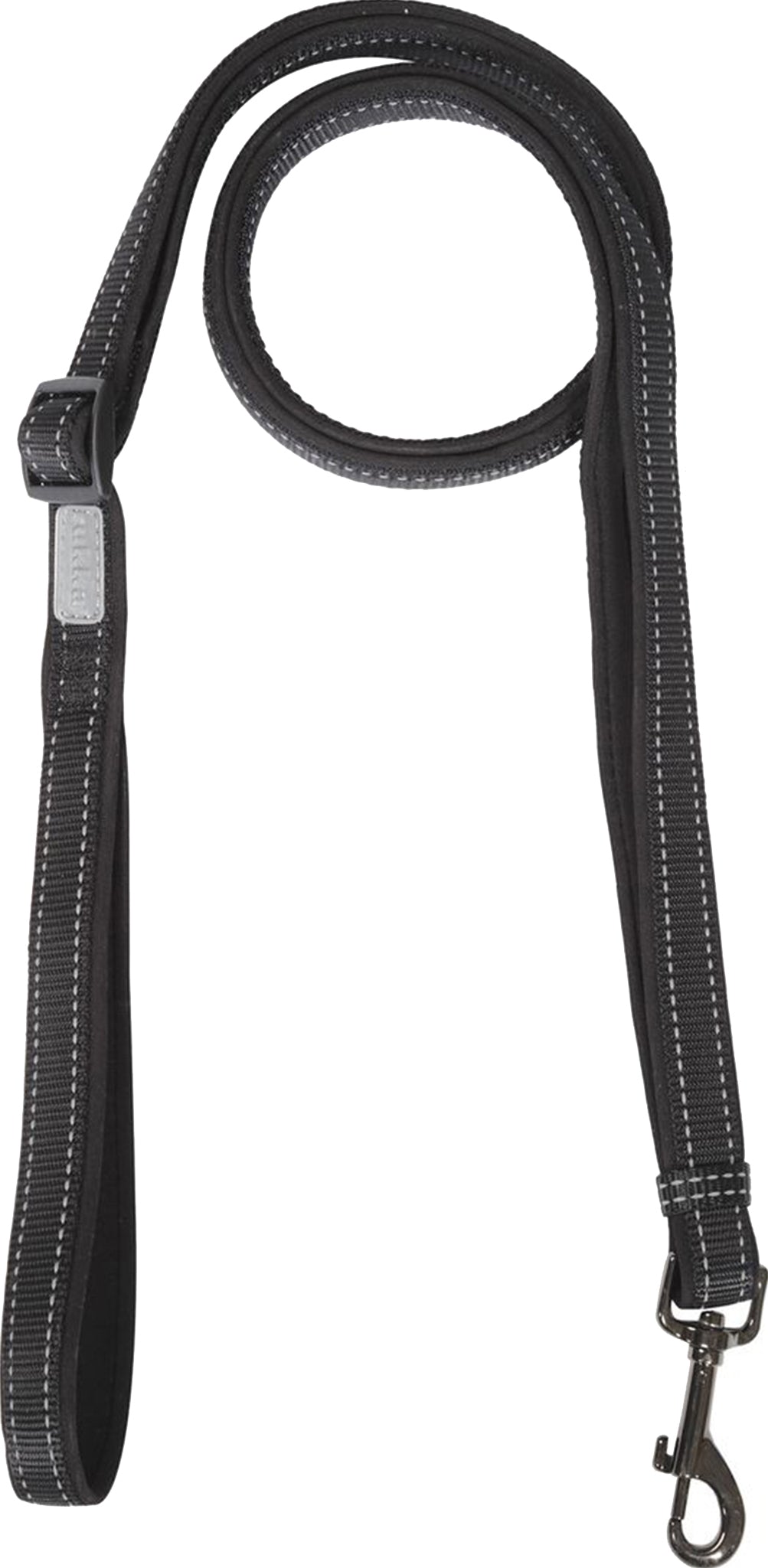 The back side of the durable and practical leash is made of comfortable and soft neoprene. Designed to give a more secure and comfortable grip on the leash. The leash is adjustable in length. There is a stylish gunmetal finish on the rotating snap hook and other metal parts. The machine-washable leash has reflective stitching and logo.
