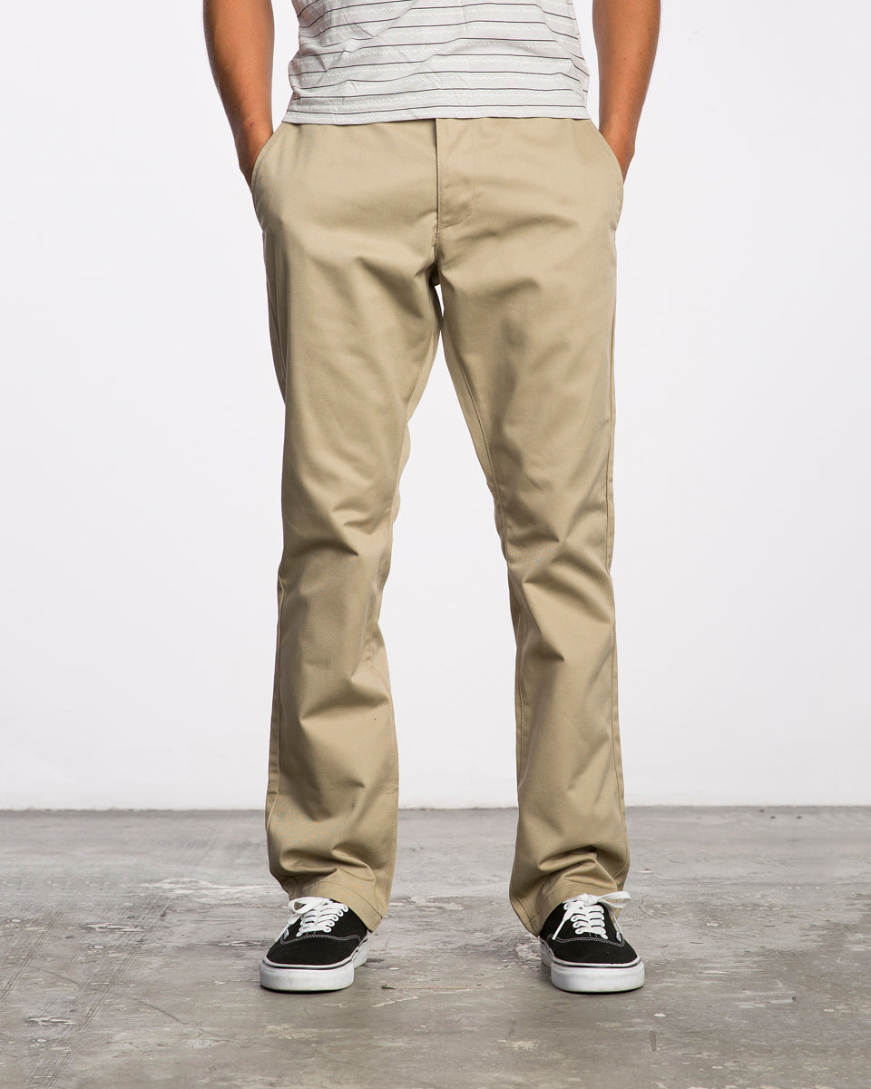 The RVCA Week-End Pants are stretch, straight-fit twill slack pants with a medium rise and a straight leg. The stretch fabric keeps your legs moving freely, while their comfortable chino cloth is made for durablity. They are finishied with a zipper fly, front slash pockets, and single welt pockets at the back with RVCA solo label.
