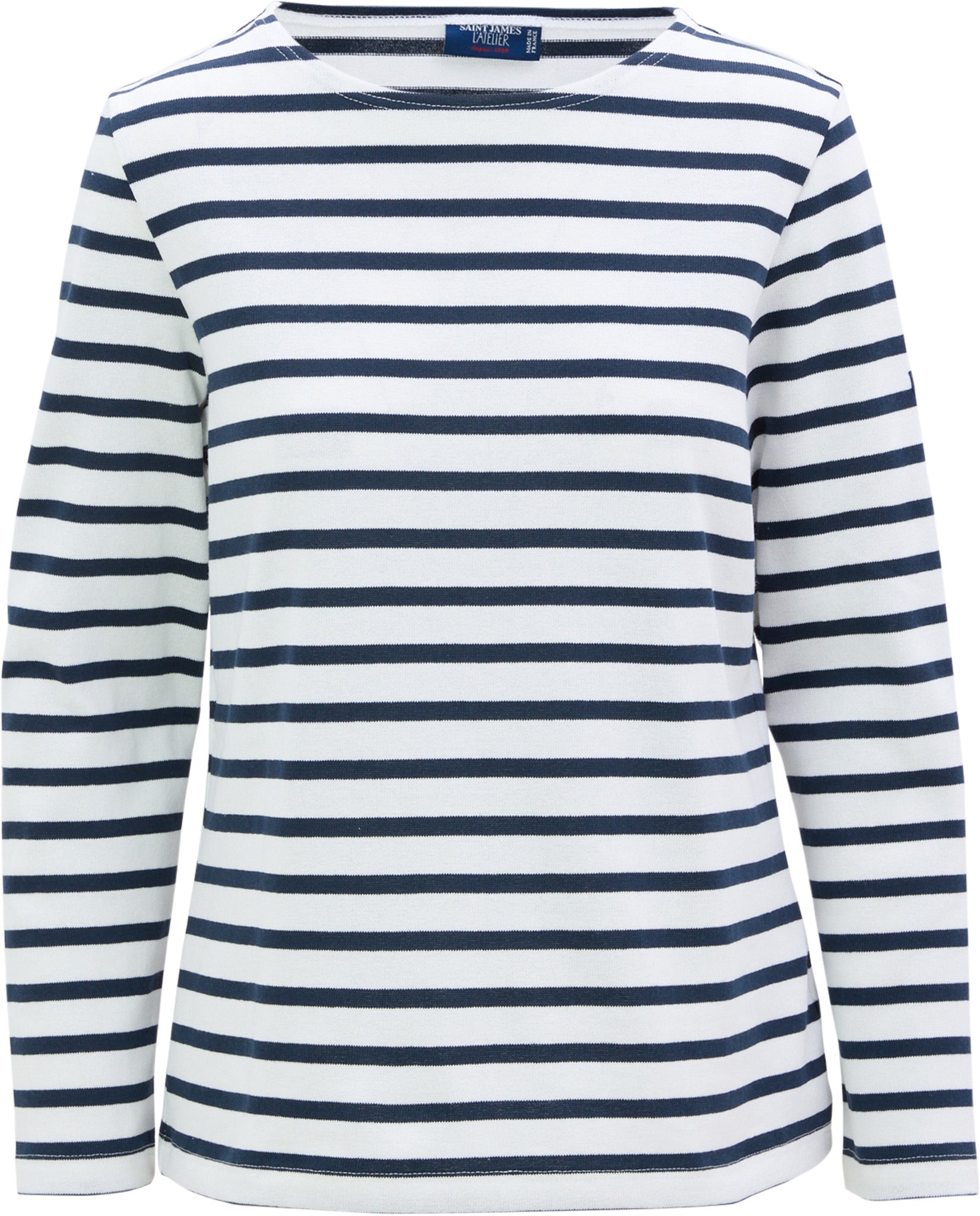 The Women’s MERIDAME II Breton Top by Saint James speaks to nautical heritage in a comfy, feminine cotton top. 100% carded cotton feels heavyweight when facing a sea-swept breeze but is light enough for cool summer nights. The crewneck collar is relaxed, pairing perfectly with accessories.