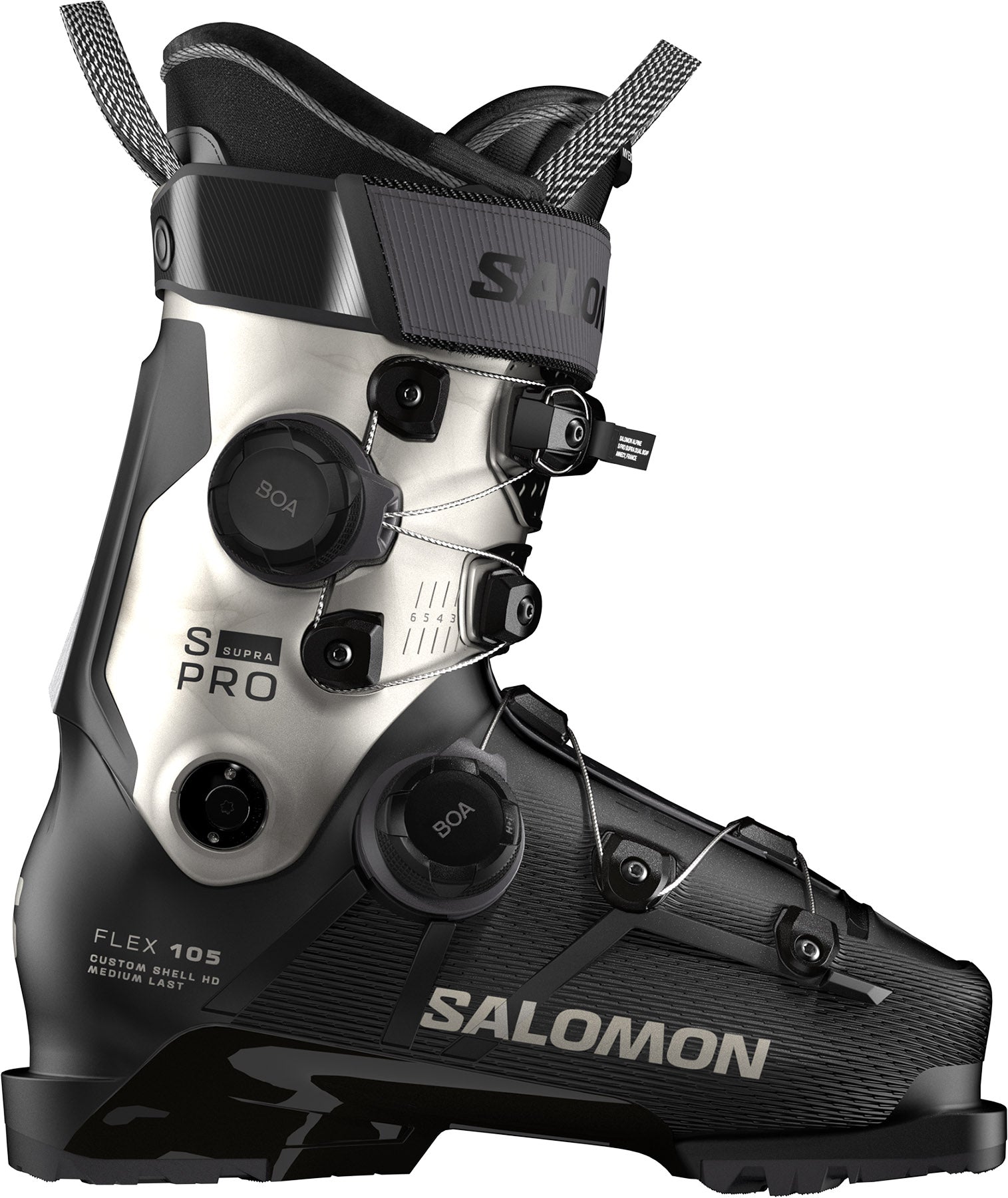• Salomon's S/Pro Supra Dual BOA® 105 women's boots revolutionize micro-adjustable sensitivity. Featuring a women-specific cuff and two BOA® dials, these boots deliver a customized fit, providing optimal support at the cuff and precise comfort in the lower shell. The result? Enhanced performance that keeps women comfortable on every slope.