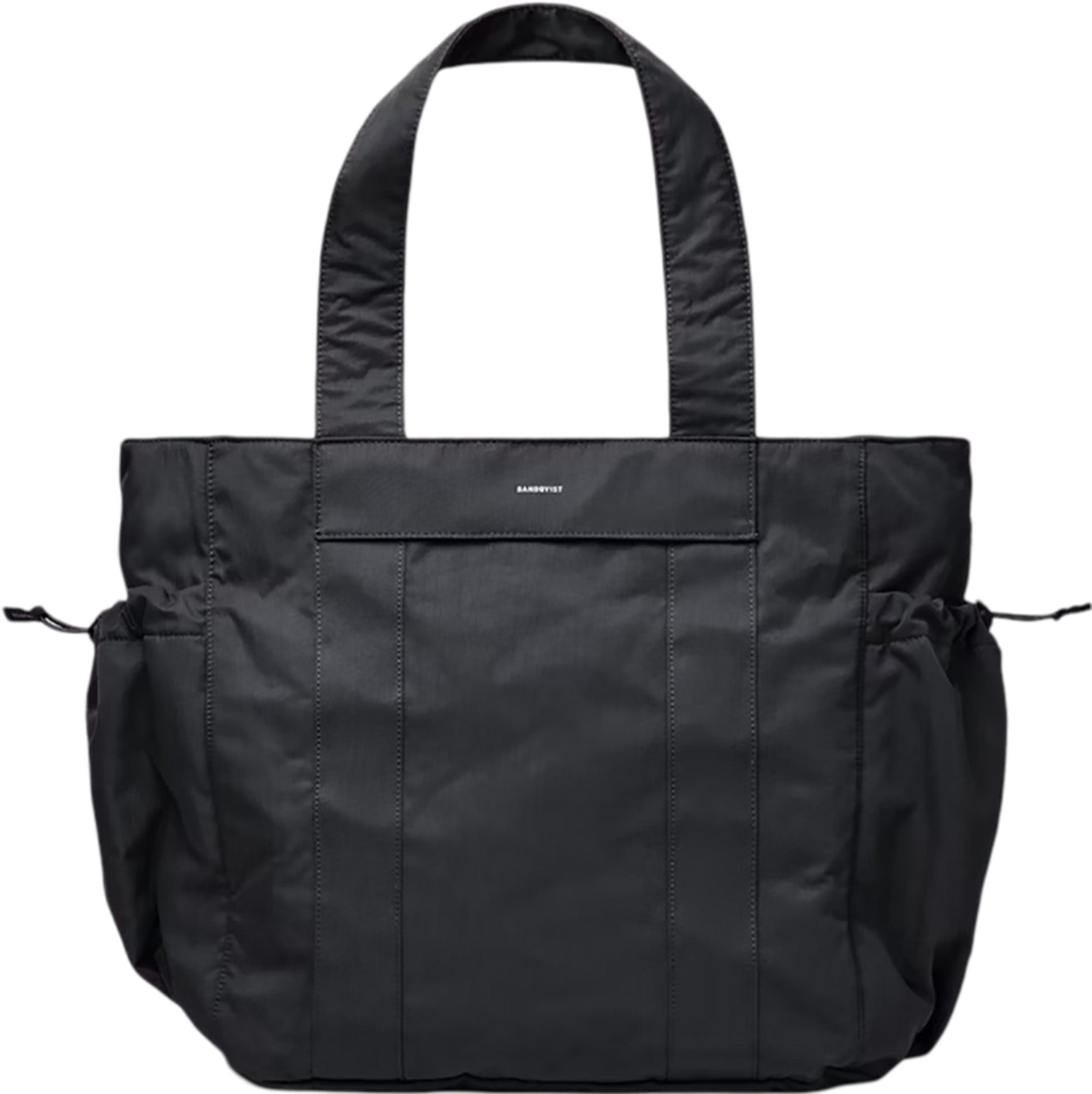 Spacious tote bag in crinkled twill made from 100% recycled nylon, constructed with a soft padding. The bag features outer slip pockets for water bottles or other essentials to bring from work to workout.