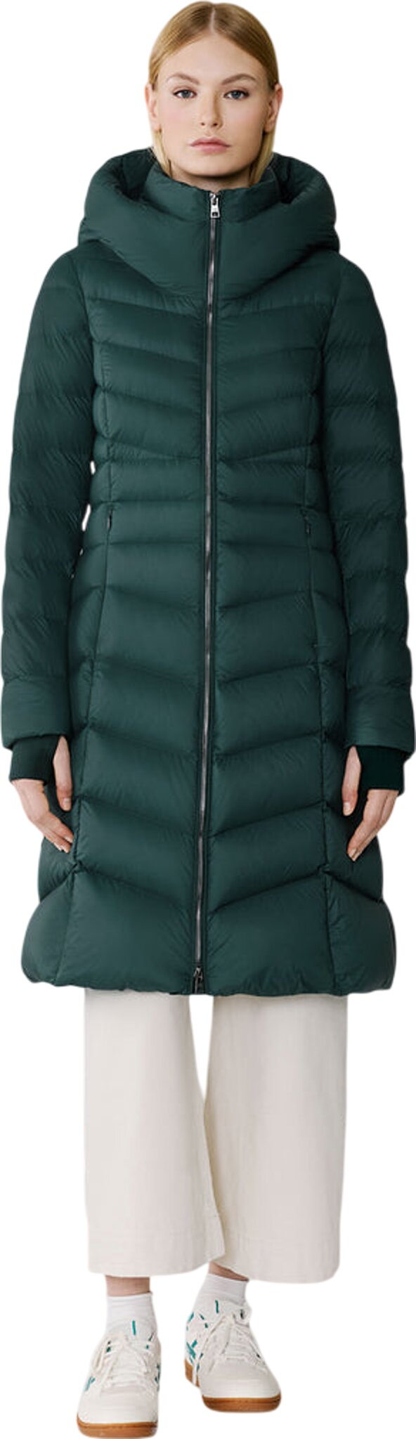 The Lita-U by Soia & Kyo combines fit & flare silhouette with variated chevron quilting and a hood. Made from 100% recycled nylon, this eco-conscious coat offers water repellency, down-proof fabric, and RDS-certified down filling, rated for -15°C warmth.