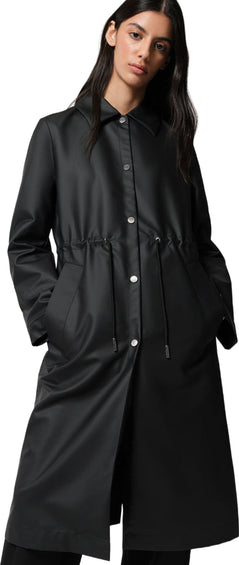 The Simone by Soia & Kyo keeps you dry and in style. Flat-felled seaming and a waterproof coating help make this hooded raincoat your greatest defender against rainy season. A modern shirt collar and an adjustable drawcord were added to elevate your look. Semi-fitted and calf-length.