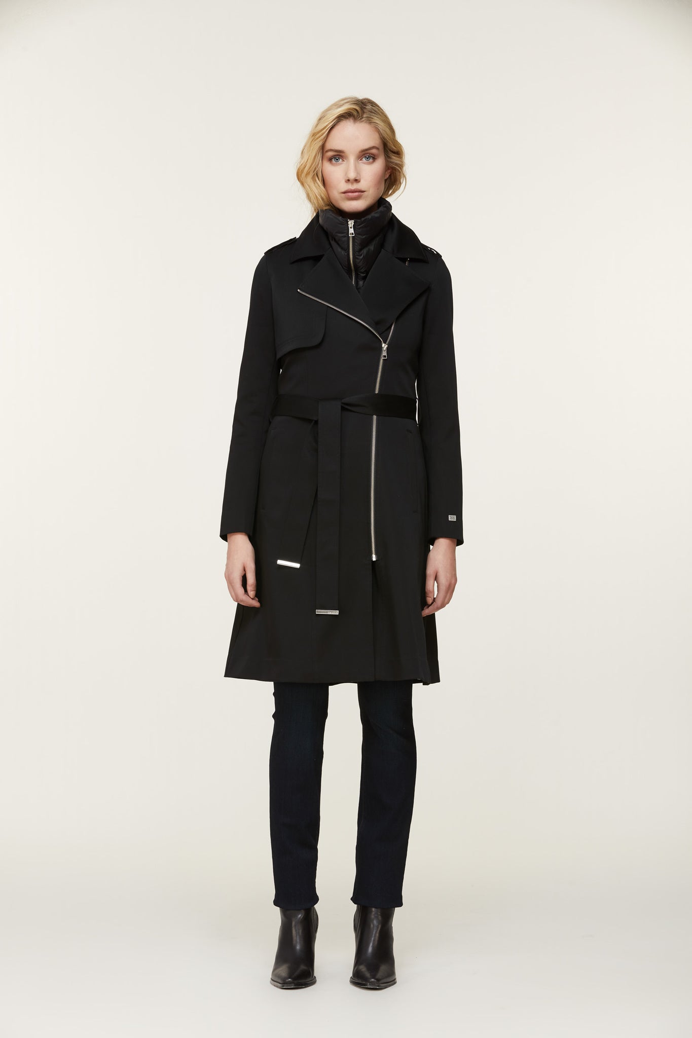 The Women’s MARESA Jacket by Soia & Kyo SEMIRA Jacket does it all – sheds light moisture and snow, keeps you warm, goes with anything in your wardrobe, and lets you adjust to the weather. The outer trench coat is a cotton-blend woven shell with stretch. When the weather warms up remove the quilted insulated vest as needed. An A-line fit in a knee-length cut make a profile always in style. Cinch the waist belt or zip up the notch collar when the wind picks up.