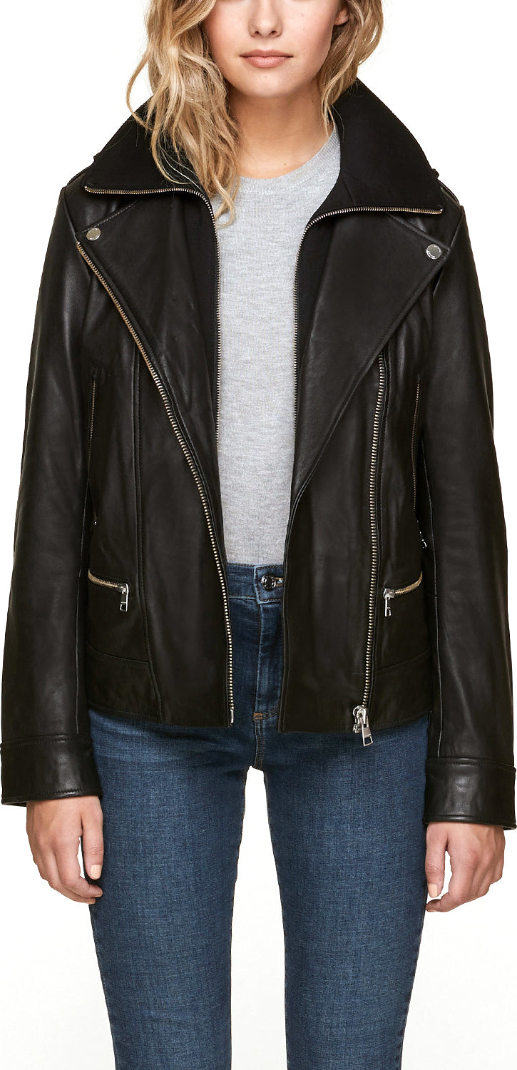 Brandy is a modern leather jacket with a moto collar and straight silhouette, perfect to enhance mid-season outfits. Features a fashion-forward asymmetrical zipper closure and removable knit bib for multi-season versatility. A stretch printed lining allows for easy movement.
