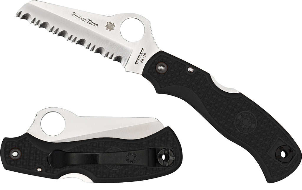 A smaller equivalent of the C14 93mm Rescue, it too has a flat saber-ground, SpyderEdge, VG-10 blade that ends in a sheepfoot safety tip. For smoother thumb rotation we enlarged the Spyderco Trademark Round Hole, which in turn creates a prominent hump to position the thumb on while cutting. The FRN waffle textured handle is available in indigo blue, black and safety orange with an ambidextrous, tip-up pocket clip.