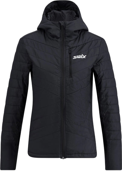 The Dynamic Insulated Jacket for women is a perfect match for cross-country skiing in cold and windy weather at high intensity. The body-mapped construction of this jacket will keep you warm and dry thanks to a heavier recycled PrimaLoft thermally insulation at the front, on outer sleeves and on hood. The back panel is made of lighter PrimaLoft thermal insulation for optimal comfort. The arms, underarms and side panels feature a 3-layer material for wind protection.