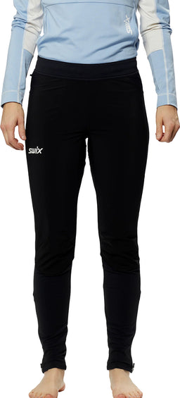 Focus wind tights are made of an advanced high density double-knit with a very comfortable wicking brushed terry inside, that traps a layer of air and transports moisture away from the skin. What separates this from the Focus Warm tight is the high density stretch woven at the front thigh area. This fabric makes the front more windresistant and water repellent. There is no windproof membrane, but the high density surface stops most of the air speed and limit the wind-chill. Lack of membrane results in unhindered breathability and freedom of movement like a proper pair of tights. In the long run; the dry ventilating sensation is more comfortable than fully windproof but far less breathable membrane alternatives.