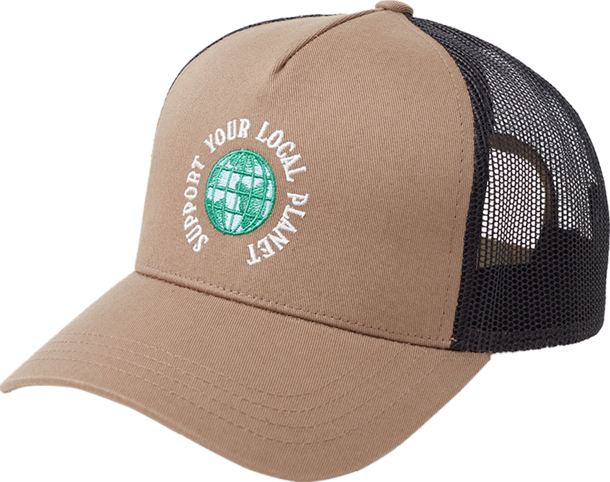 Support your local planet with this 5 panel organic cotton hat.• Adjustable fit• Curved recycled plastic brim• Adjustable snapback closure with mesh back• Embroidered front artwork graphic• Minimal 2 way stretch woven fabric• Cork label• Recycled meshMaterials• 100% Organic Cotton