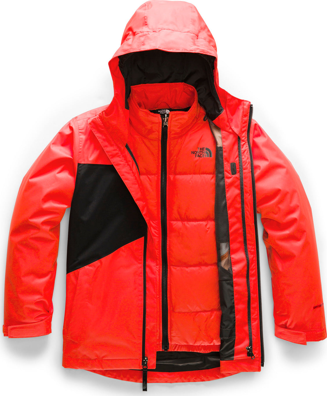 The Boy’s CLEMENT Triclimate Jacket by The North Face has a zip-in inner jacket for three looks in one package – a shell, an insulated puffy, and both together for the ultimate ski resort jacket. The outer shell is completely waterproof, breathable and has sealed seams against moisture. The inner jacket zips into the shell. It uses a synthetic insulation that stays warm even if damp from sweat building up on the runs downhill. A powder skirt keeps the snow on the outside. There are zip pockets on the shell jacket and side welt pockets on the puffy insulator.