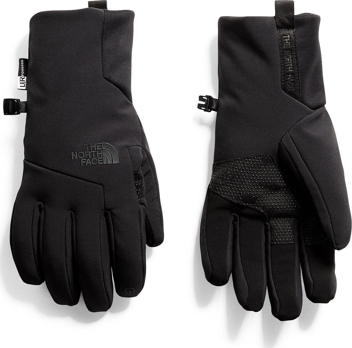 The women's APEX ETIP Gloves by The North Face are designed for long-range, cold-weather adventures, with insulation, windproofing and water resistance. The fabric shuts out the wind, stretches and is treated with a durable water-repellent (DWR) finish. Back-of-hand synthetic insulation stays warm even if damp. Synthetic suede palms have a silicone grip print. Brushed tricot lining feels great every time you slip them on. The articulated construction lets your hands relax in their natural position.