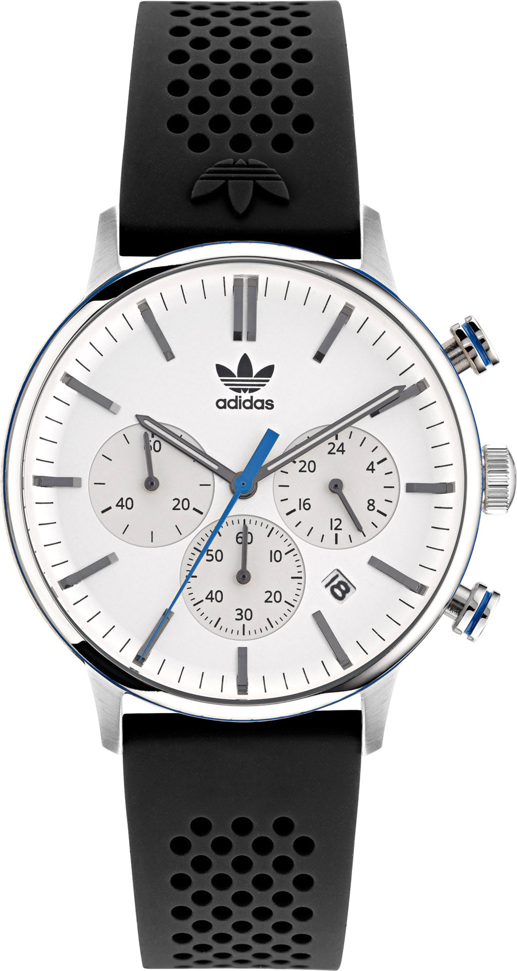 This Code One Chrono watch combines sporty elegance with technical functionality. The timeless round silhouette hosts a six-hand chronograph, a 24-hour sub-dial and a window date, and features the unmistakable adidas Originals signature blue colour.