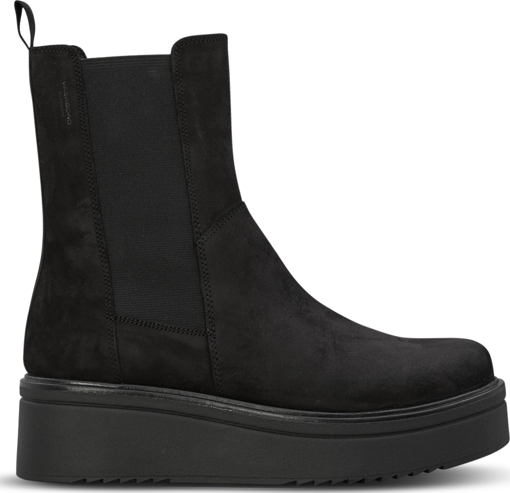 Tara is the platform Chelsea boots with an updated silhouette. The style is crafted in black nubuck featuring elastic side panels, rounded toes and pull-on tabs. The contrast-coloured platform outsoles measure 55 mm. Details include pull-on tabs.