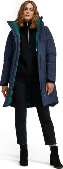 Highly-insulated 800 down fill parka. Features long, shaped women’s-specific fit and insulated zipper-removable hood. Ultra light, water-repellent matte Pertex Shield exterior fabric blocks wind and snow. Designed for urban-centric style and premium functionality in Canadian winter weather.