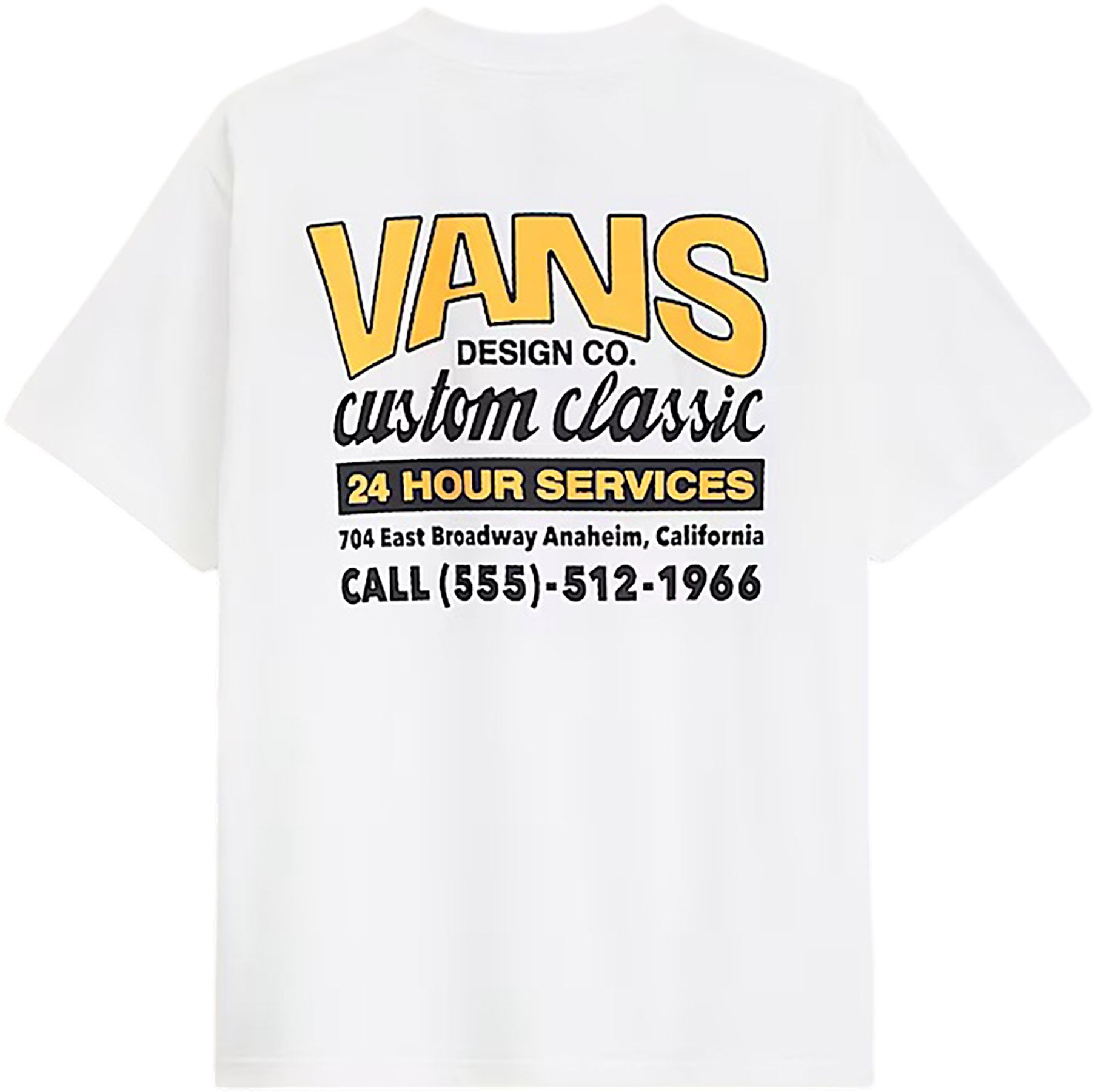 Wear a piece of Vans history in the Shop Front T-Shirt, paying homage to the company's first factory. This classic fit short sleeve crew neck T-shirt features a screenprinted graphic of a Vans® logo on the front, with a retro storefront ad of the factory's address on the back.