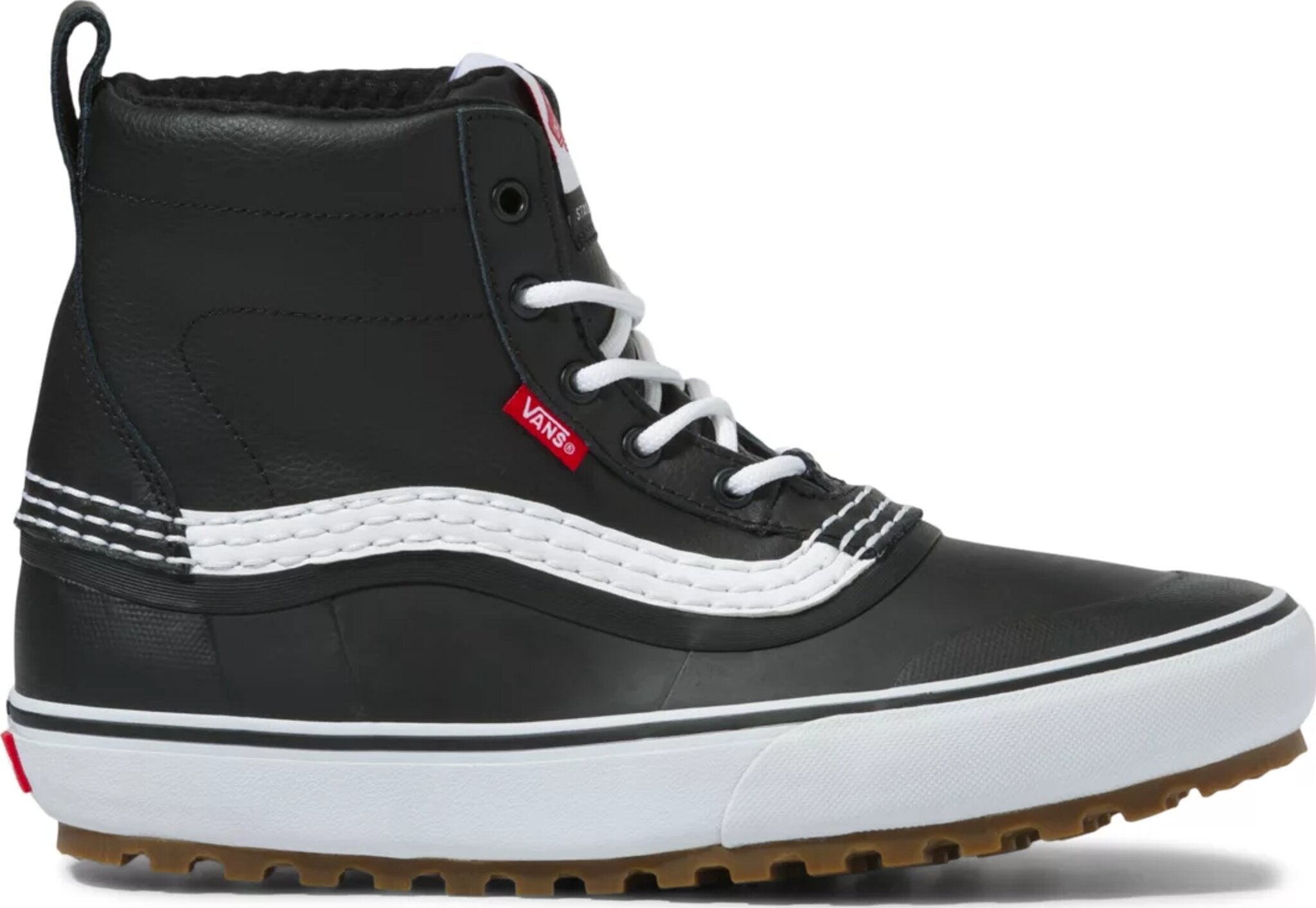 Practical, packable, and wear-at-the-bar-able, the Standard Mid Snow MTE is a downsized version of Vans’ best-selling Standard Snow MTE snow boot. With a waterproof vulcanized lower, waterproof seam-sealed construction, a Standard Snow MTE outsole, and a 100-gram weight insulation package, classic Vans style and day-to-day winter weather footwear have finally converged. This mid top boot is made with leather and synthetic uppers.