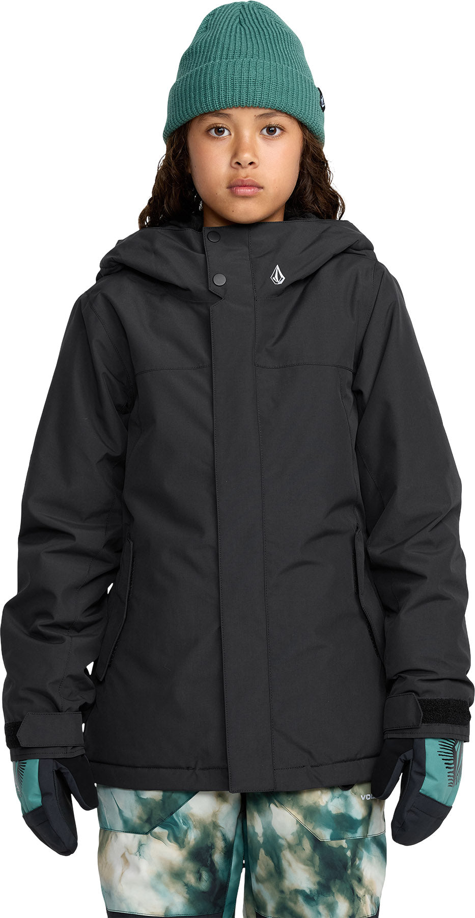 THe Miiinty Insulated Jacket is a heavily insulated girl's snowboard jacket designed for cold-day resort riding. It is constructed from a V-Science 2-layer, 10,000mm / 10,000g/m² waterproof/breathable fabric and treated with a PFAS-free DWR. The body is packed with 200g of recycled insulation (80g in the sleeves) for maximum warmth. It's fully equipped with Volcom's key tech, including the Zip Tech® jacket-to-pant interface, a helmet-compatible hood, and mesh-lined zippered vents. Critically taped seams help seal out snow, while the Grow-Tech system allows the sleeves to be lengthened, extending the life of the jacket.