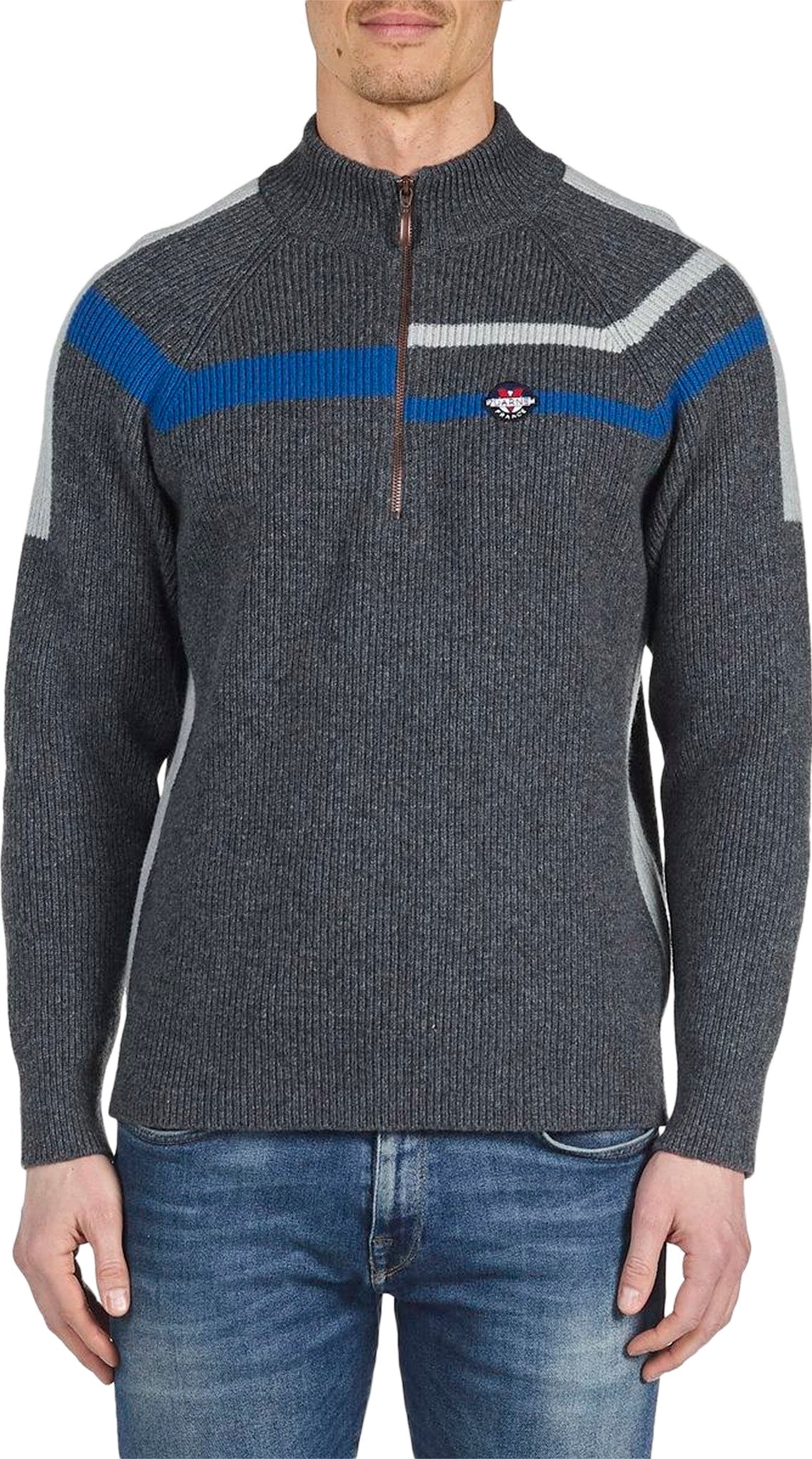 A comfortable and warm sweater for the colder days, coloured in dark grey with elegant blue and white lines and the embroidered Vuarnet logo on the chest. Made from wool and polyamide with a rising neck and zipper offering you optimal comfort without compromising your style.