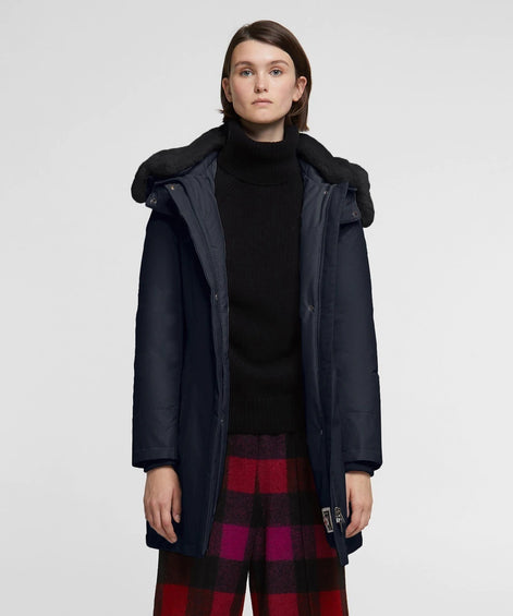 Long parka featuring a fox fur lining on the hood, jetted pockets and a zip and button closure.
