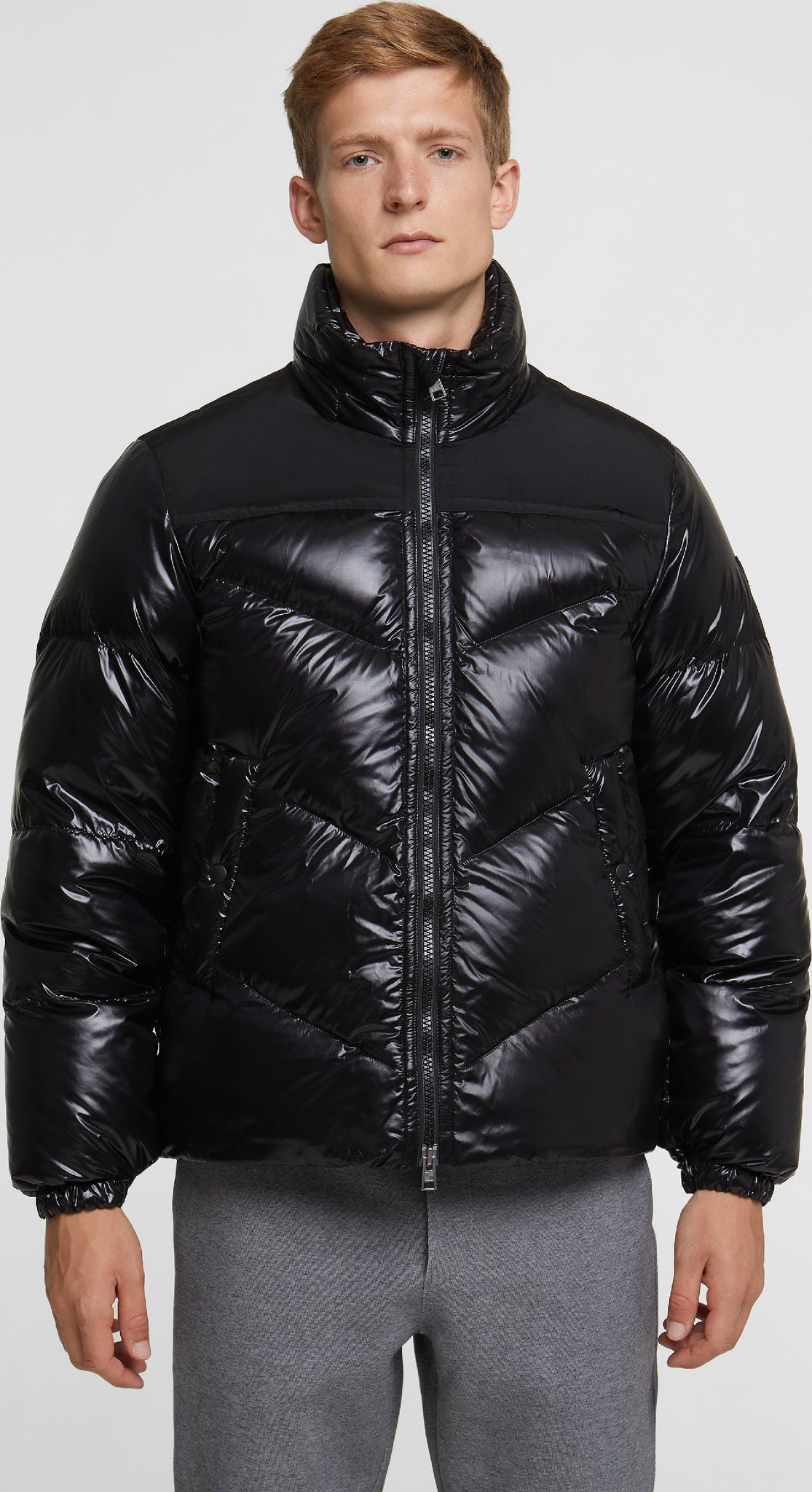 Features • Shell fabric content, glossy: 100% polyamide • Shell fabric content, matte: 60% cotton, 40% polyamide • Lining fabric content: 100% polyamide • Lining detail fabric content: 100% wool • Insulation: 90% grey duck down, 10% feathers • Full-length zip-closure front • Two hand-warmer pockets • Internal dump pocket • Internal zip-closure security pocket • Stand-up collar with concealed hood • Care instructions: dry clean professionally, can cool iron • Imported • Regular fit