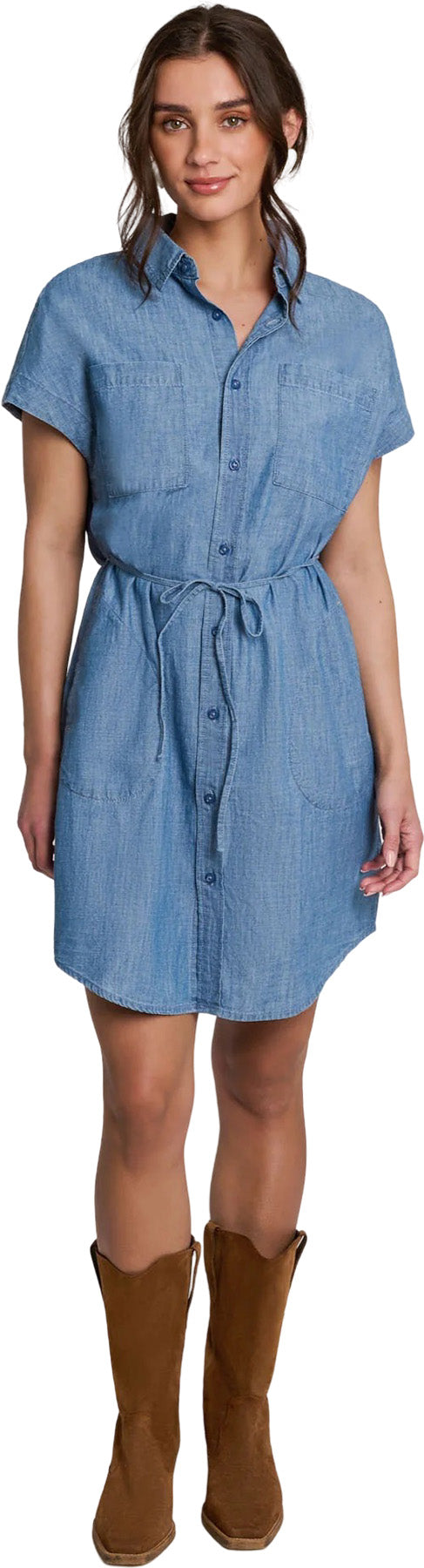 Introducing our Salvia Chambray Shirt Dress-a stylish throwback to the early 2000s. Fitted at the shoulders and straight through to the hips, this dress then gently flares out around the hips for a relaxed, flattering fit that lets you move freely.